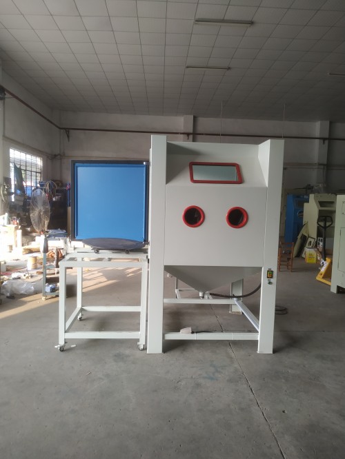 2、可加装活动台车和转盘,操作时需将工件放在台车转盘上,然后将推入机内即可从事喷砂作业,十分简单省力, 推车可在车间推动行走。载重:150公斤。