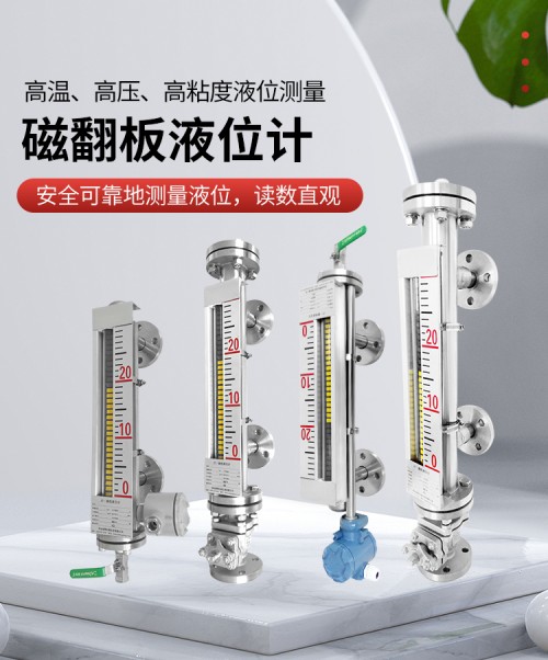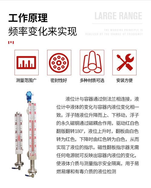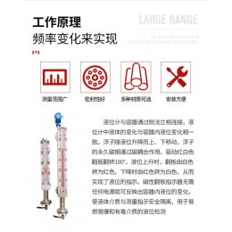 以侧装基本型磁性液位计为例:液位计与容器通过侧法兰相连接,这样液位计中液体的变化与容器内液位变化时相 致的。浮子在测量管内随液位的升降而上、下移动,浮子内的磁钢通过磁耦合作用,驱动红白色翻版翻转180°,液位上升时,翻板由白色转为红色,下降时由红色转为白色,从而实现了液位的指示。