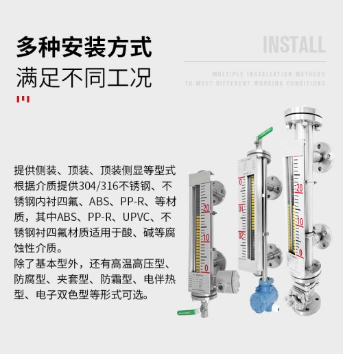 根据在容器安装位置不同,提供侧装、顶装、顶装侧显等型式。根据工作介质的不同,提供304/316不锈钢、不锈钢内衬四氟、ABS、PP-R、UPVC等材质,其中ABS、PP-R、UPVC、不锈钢衬四氟材质适用于酸、碱等腐蚀性介质。除了基本型外,还有高温高压型、防腐型、夹套型、防霜型、电伴热型、电子双色型等多种形式可供选择。
