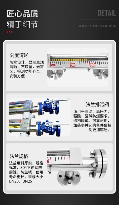 由于磁性翻板指示器在无需任何电源的情况下就可反映出容器内液位的变化,使液体介质与测量指示安全隔离,为易燃易爆和有毒介质的液位检测提供了安全可靠的手段和方法。