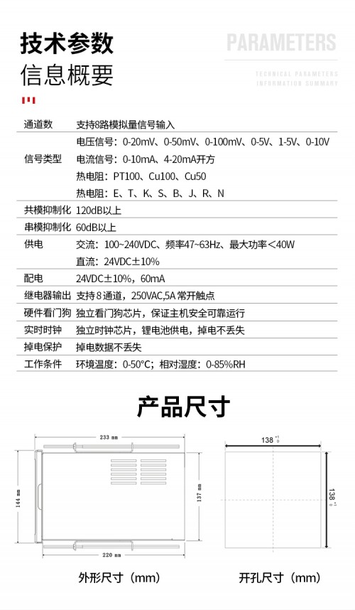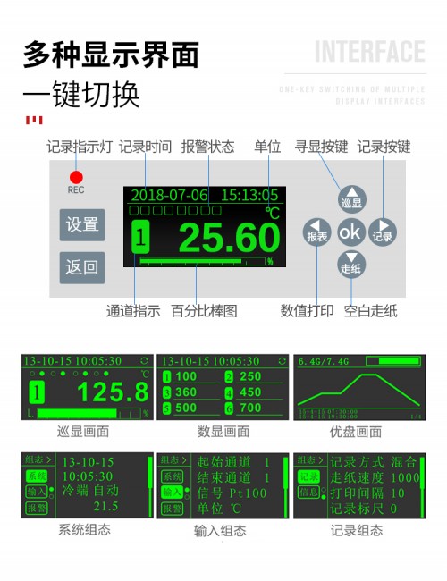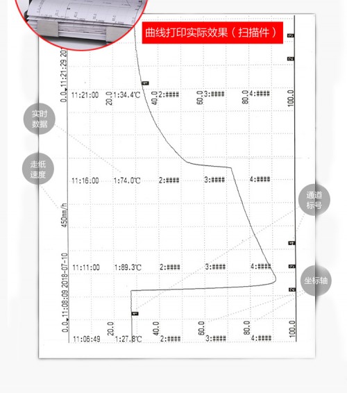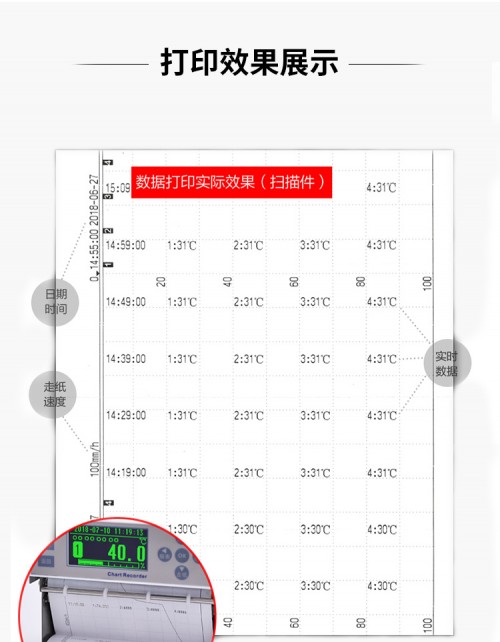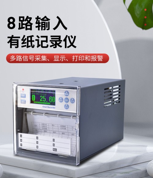 GT11R有纸记录仪打点打印走纸式温湿度压力电流电压记录仪提供8路高精度模拟信号输入通道,可配置8路报警,可提供传感器配电,采用高精度热敏打印机, 实现高精度数据、曲线和混合打印;具有高清晰OLED液晶显示功能,提供实时数据单屏、多屏、棒图等显示, 提供报警状态显示;独立的纸仓设计使打印纸安装方便快捷。人性化的外观设计、良好的硬件品质、的制造工艺, 具有性价比。