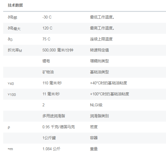 MULTI2(L78V):矿物油,工作温度 -30度 — +120度,连续工作*限温度75,增稠剂类型:锂皂,粘稠度(NLGI等*)2.用于球轴承,直径小于或等于62MM,应用于小型电动机,农用和建筑机械,*用电器。 相关搜索《《润滑脂发货实录,安徽捷越FAG ARCANOL润滑脂发货实录,润滑脂TEMP90发货实录