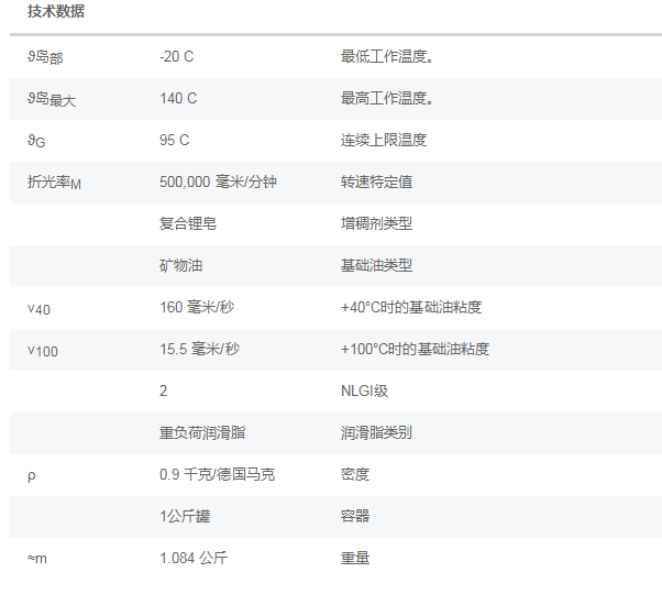 LOAD150(-):矿物油,工作温度-20度— +140度,连续工作*限温度95,增稠剂类型:复合锂皂,粘稠度(NLGI 等*)2,专用油脂用于球轴承,滚子和滚针轴承,以及直线导轨系统,应用于机床,适用于重载荷,各种速度范围,旋转机构。相关搜索《《润滑脂发货实录,安徽捷越FAG ARCANOL润滑脂发货实录,润滑脂TEMP90发货实录