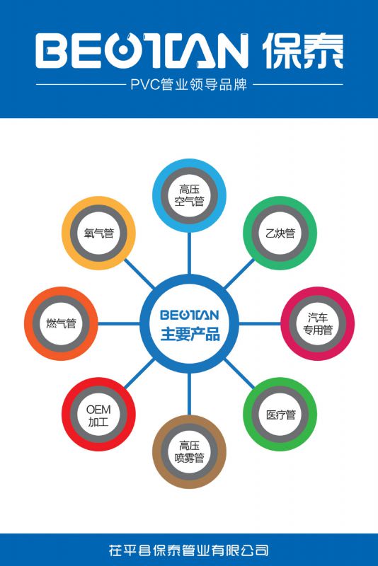 山东茌平保泰管业有限公司,位于风景秀丽的江北水城——聊城,是 家集PVC编制软管的研发,生产,销售于 体的企业。公司采用 进的生产工艺,独特的创新配方,优质的生产原料,严格执行质量体系标准,完善的售后服务,使产品质量 直处于国内的高端水平。