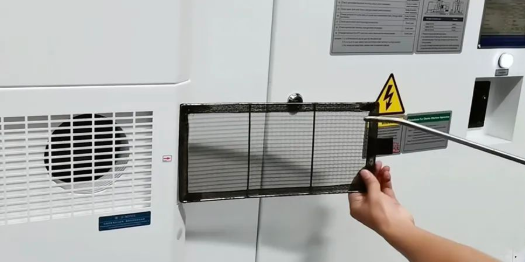 清洗电箱热交换器或空调的过滤网和油冷机过滤网, 用气枪清洁电箱过滤盖板, 待重新安装上干净的过滤网后, 电箱内放入干燥剂, 防止开启电源时因潮湿烧断电器元件。