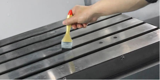 清理工作台、T型槽等区域,直至没有切削液和碎屑积存,工作台和T型槽涂上导轨油防锈。