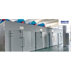 2、合适温度的热风经由热风管道进入竹笋烘干机-烘干房后在内置循环风机的作用下水平循环,期间接触物料,带动物料升温,同时带走物料水分;当循环热风达到 定湿度值时,排湿系统工作,排出湿气,同时补充新风继续循环;