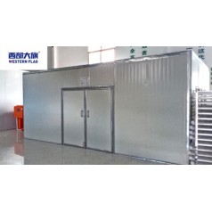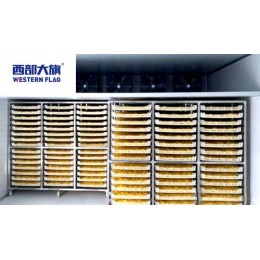 将装好皇菊的烘车推入西部大旗烘干房内,然后关闭烘干房的门,打开烘干房电源。这里以西部大旗空气能热泵烘干房为例设置烘干参数: 阶段8小时,温度45℃,二阶段8小时,温度50度,三阶段6小时,温度55度。设置完毕,返回初始界面,点击开机即可。设备会自动运行,注意每隔8小时要观察 下金丝皇菊烘干情况。待烘干房内湿度降至13%左右即可出炉。