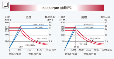 齒輪式高扭力主軸高低檔強力齒輪箱設計浮動式油壓鬆刀機構,鬆刀時主軸軸承不受任何力量6,000 rpm 高扭力主軸,搭載高馬力輸出 26 kW 主軸馬達,在 387 rpm 亦可提供 642 N-m 的扭矩輸出6,000 rpm 齒輪式