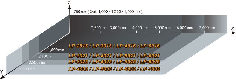 工作台尺寸 ( X 方向 ) | 3,020 mm | 4,020 mm | 5,020 mm | 6,020 mm |