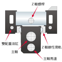 中心對稱式主軸系統設計將主軸、馬達、滾珠螺桿、雙配重油壓缸與齒輪箱做之空間配置,有效抑制熱變位與減低不平衡力矩的產生,確保加工精度與重切削能力