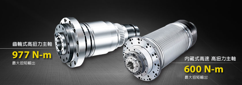 齒輪式高扭力主軸高低檔強力齒輪箱設計浮動式油壓鬆刀機構,鬆刀時主軸軸承不受任何力量4,000 rpm 高扭力主軸,搭載高馬力輸出 26 kW 主軸馬達,在 254 rpm 提供 977 N-m 的扭矩輸出,符合重切削加工的需求另可選配 5,000 / 6,000 rpm 齒輪式主軸