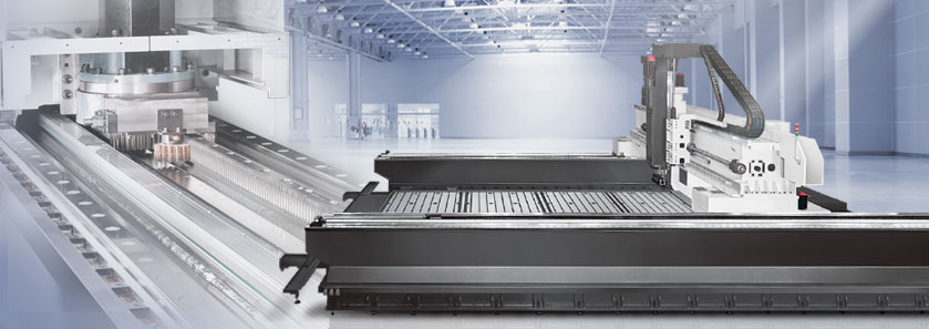 採用大尺寸雙導螺桿、雙伺服馬達及雙線性光學尺同步控制驅動,將同動誤差降至,確保動態精度X 軸行程 6 m 以上之機型