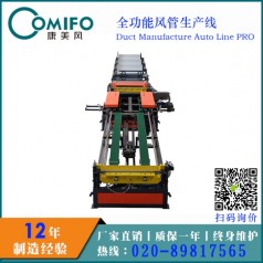 全功能风管生产线, 台含风管需求的所有功能于 身,由电动送料架,调平压筋,冲中间加强孔(选配),冲方口,冲尖角,冲法兰孔(选配),剪切,升降型专利辘骨机(此专利设备同时实现剪切,联合角咬口成型,直角骨咬口成型),双机联动TDF共板法兰成型,角钢法兰小边成型,全C骨法兰成型或C/S骨法兰成型(选配),定位传送平台(选配),TDF液压折边机组成。采用PLC控制,触摸屏操作,可根据操作要求设置任意尺寸进行下料,配备标准电动送料架承重7吨,可根据客户要求选配4吨(工地用)、8吨或10吨送料架。