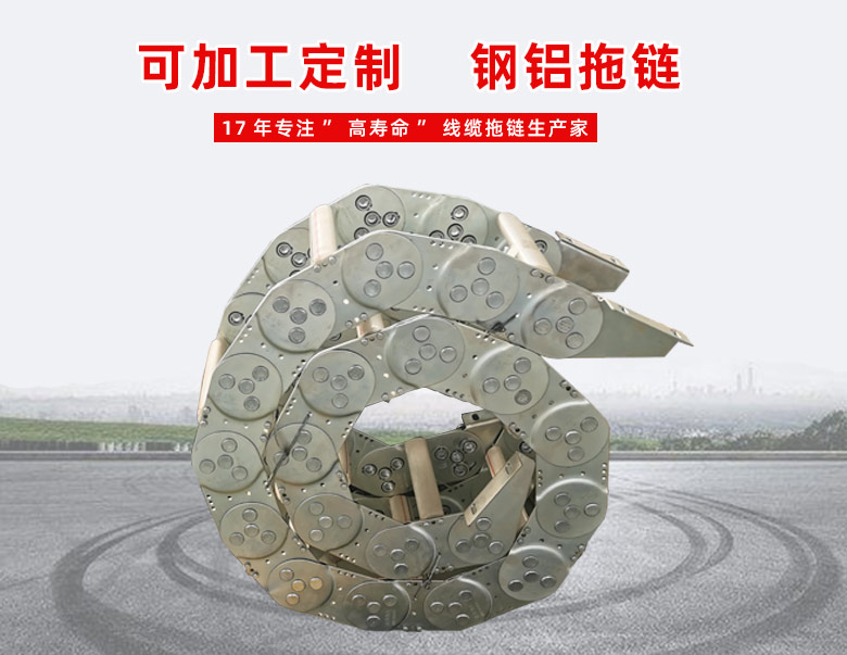钢制拖链的主体是由链扳(钢板镀铬)支撑扳(挤拉铝合金)轴销(合金钢)等部件组成,使电缆或橡胶管与拖链之间不产生相对运动,不产生扭曲变形,链扳经镀铬处理外形效果新颖结构合理,灵巧强度高,钢性好不变形,安装方便,使用可靠,易拆装,尤其是采用高强度耐磨材料,合金铜为轴销,提高了产品的耐磨强度,弯曲更灵活,阻力更小,降低了噪音,从而可保证长时间使用不变形,不下垂。