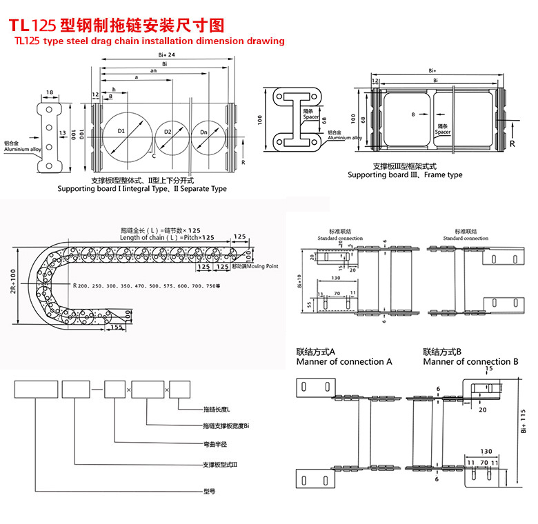 2.钢制拖链的支撑板宽度为 150mm 至 800mm, 孔与孔之间的间隔量为10mm.链板的高度也就是支撑板的高度,是由电缆zui大直径决定的.