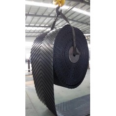 产品用途:花纹输送带是由工作面为花纹状的覆盖胶和非工作面为平面的覆盖胶与带芯构成的倾角输送带。带面上有高于带体的“人”字型花纹,花纹可是开口的也可是闭口,每 种花纹可分为(高、中、低)。