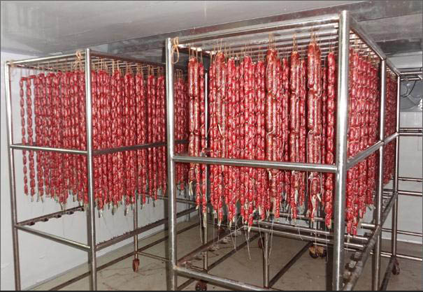 腊肠为广东、香港、澳门和南方地区常见的辣味,是经过压缩、脱水以及晒干等程序制成的。腊肠的质量好坏除了本身的配料工艺之外,更重要的是烘干除湿工艺,腊肠在干燥除湿过程不仅要除掉物料里面的水分,还要在外观上保留原有的色、香、味、形等感官的指标。为了保存和保质期内不变质,所以和烘干除湿息息相关。