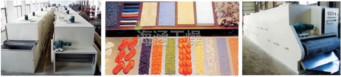 物料由加料器均匀地铺在网带上,网带 般采用12-60目不锈钢丝网,由传动装置拖动在干燥机内移动。干燥机由若干单元组成,每 单元热风独立循环,部分尾气由专门排湿风机排出,废气由调节阀控制,热气由下往上或由上往下穿过铺满物料的网带完成热量与质量传递的进程,带走物料水份。网带缓慢移动,运行速度可根据物料温度自由调节,干燥后的成品连续落入收料器中。上下循环单元根据用户需要可灵活配备,单元数量亦可根据需要选取。