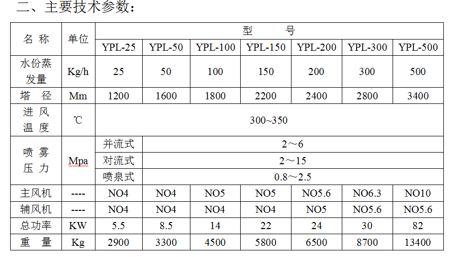 二、YPG压力喷雾造粒干燥机主要技术参数