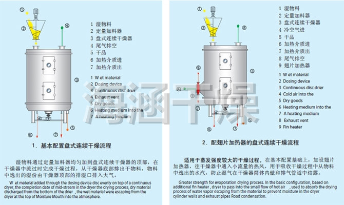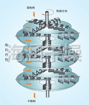 湿物料自加料器连续地加到干燥器上部 层干燥盘上,带有耙叶的耙臂作回转运动使耙臂作回转运动使耙叶连续地翻抄物料。物料沿指数螺旋线流过干燥盘表面,在小干燥盘上的物料被移送到外缘,并在外缘落到下方的大干燥盘外缘,在大干盘上物料向里移动并从中间落料口落如下 层小干燥盘中。大小干燥盘上下交替排列,物料得以连续地流过整个干燥器。中空的干燥盘内通入加热介质,加热介质形式有饱和蒸汽、热水和导热油,加热介质由干燥盘的 端进入,从另 端导出。已干物料从 后 层干燥盘落到壳体的底层, 后被耙叶移送到出料口排出。湿份从物料中逸出,由设在顶盖上的排湿口排出,真空型盘式干燥器的湿气由设在顶盖上的真空泵口排出。从底层排出的干物料可直接包装。通过配加翅片加热器、溶剂回收冷凝器、袋式除尘器、干料返混机构、引风机等辅机,可提高其干燥的生产能力,干燥膏糊状和热敏性物 料,可方便地回收溶剂,并能进行热解和反应操作。