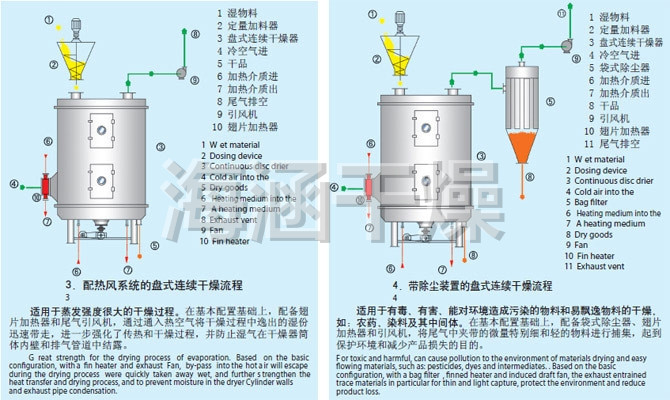 ◎加热介质:蒸汽、热水、导热油、干燥盘温度100℃时使用热水加热,100℃~150℃时用≤0.4MPa饱和水蒸汽或者过热蒸汽加热,150℃~320℃时用导热油加热,>320℃时可采用电、导热油、熔盐等方式加热。