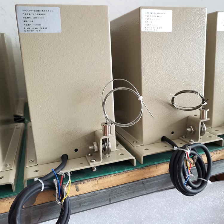 HZS型主令恒力收绳闸门开度传感器,从内部拉出 根钢丝绳与被测闸门直接联结,闸门提升或下降时钢丝绳带动与编码器同轴的测轮旋转,使编码器与被测闸门同步转动,从而将被测闸门的启降转化为编码器轴的旋转,输出相应的位置信息。同时带动主令轴旋转,控制闸门开启、关闭的上、下限,从而达到了对被测闸门位移的实时测量同时控制闸门上、下限的目的。其内部的机械机构主要由恒力弹簧、弹簧轮、测轮、轮轴、齿轮箱、凸轮、限位开关等组成,下降过程由闸门拉动弹簧反绕,带动机械机构转动,上升则由反绕弹簧产生的力量带动机械转动、拉动钢丝绳上升。该传感器结构合理,安装简便、抗干扰能力强,分辨率高,量程大,寿命长,集检测与A/D转换为 体,有掉电后信号跟踪记忆功能。它能够长期用于被测件位移量的检测,并能保证性能的稳定可靠。适合对各类闸门(平板门、弧形门、人字门、门机、桥机等)的起吊高度进行测量,控制。是江河湖泊、水库、船闸、水电站、水文站、水厂及石油化工等行业理想测量与控制位移的传感器。