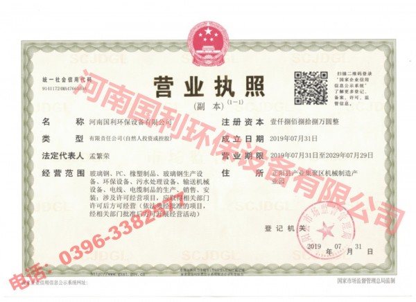 证书介绍 河南国利环保设备有限公司营业执照,本公司主营玻璃钢(玻璃钢化粪池、玻璃钢格栅、玻璃钢管道、玻璃钢拉挤型材、玻璃钢冷却塔)、PC、橡塑制品、玻璃钢生产设备、环保设备、污水处理设备、输送机械设备、电线、电缆制品的生产、销售、安装。