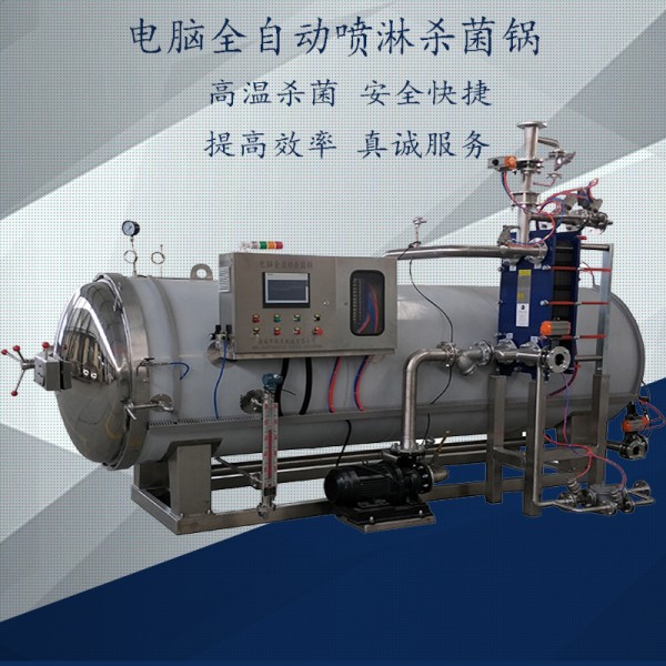 竹笋罐头杀菌锅升温快,锅内进入少量循环水,并采用大功率电热管加热,包装物在10-15分钟内可以从20度迅速升温至121度。2、罐内温度稳定、热分布均 热水喷淋系统在处理罐内每 个托盘的四个角上均设有 系列喷嘴,使雾化热水与产品充分接触,从而保证了设备内部各点的温度 致。罐头喷淋式反压杀菌锅特点:间接加热和冷却,阻止二次污染。循环水通过板式热交换器被间接地加热或冷却,锅内循环水在加热或冷却时 直处于无菌状,灭菌完毕,锅内表面和包装袋表面的水滴吹干后,也不会留下白色的水垢小点,整个包装袋透明、干净,阻止二次污染。