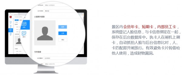 景区内会员年卡、短期卡、内部员工卡,系统登记人脸信息,与卡信息绑定在 起,保存在后台数据库中。持卡人在闸机上刷卡,自动抓拍人脸与后台信息比对,人、卡匹配即开闸放行。有效避免卡片转借给他人使用,造成财物漏洞。