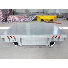 铅酸蓄电池动力物料输送地平车 无线遥控平板运输车,KPX电池供电的电动平车是 种直流电供电的平车。直流动力牵引电机提供动力,直流电机带动平车行走。对轨道 缘没有要求,所以施工方便且成本低廉。与交流电机比较,不易燃坏电机,起动的转矩大,过载能力强的优点是交流电机不具备。与其他两种电动平车对比,其灵活性和安全性展现的特点是无法超越的。