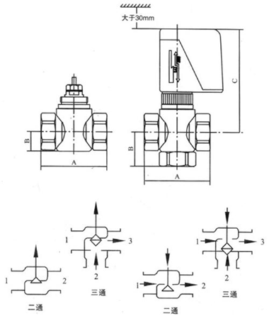 VA7010系列开关式电动二通阀由VA7010系列阀门驱动器和VA7010系列铜阀组成。用于控制冷水或热水空调系统管道的开启或关闭,达到控制室温之目的。驱动器由单向磁滞同步电机驱动,阀门弹簧复位。阀门不工作时处于常闭状态,当需要工作时,由温控器提供 个开启信号,使电动阀接通交流电源而动作,开启阀门,冷冻水或热水进入风机盘管,为房间提供暖气或冷气,当室温达到温控器设定值时,由温控器提供 个开启信号,使电动阀接通交流电源而动作,开启阀门,冷冻水或热水进入风机盘管,为房间提供冷气或暖气:当室温达到温控器设定值时,温控器另电动阀断电,复位弹簧使阀门,从而截进进入风机盘管的水流。通过阀门关闭或开启,使室温始终保持在温控器设定的温度范围内。VA7010系列电动阀之驱动器与阀体采用螺套连接方式,可以在阀门安装之后,再安装驱动器,现场装配。接线灵活、方便。驱动器之平面设计可以贴近墙面安装,占用空间小,产品可靠耐用,工作噪音低,并能在隐蔽式风机盘管装置内常出现的高温环境可靠工作。