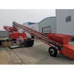 上料胶带机设计为由而节轻型桁架的铰接结构,上端铰接在车架的转料斗上,通过铰接油缸根据需要调整而节桁架之间的角度,在胶带机的下面,设计有万向轮,在油缸的驱动下可沿桁架轴向运动,可调整胶带尾部的高度,这样的设计使布料机行走时可根据需要将上料布料机拖在尾部行走而无需拆卸,或将上料胶带机驼在布料胶带机上行走,上料胶带机的上驼或卸下由布料机自行完成,无需使用吊车等辅助设备。