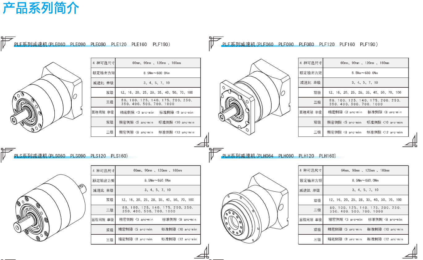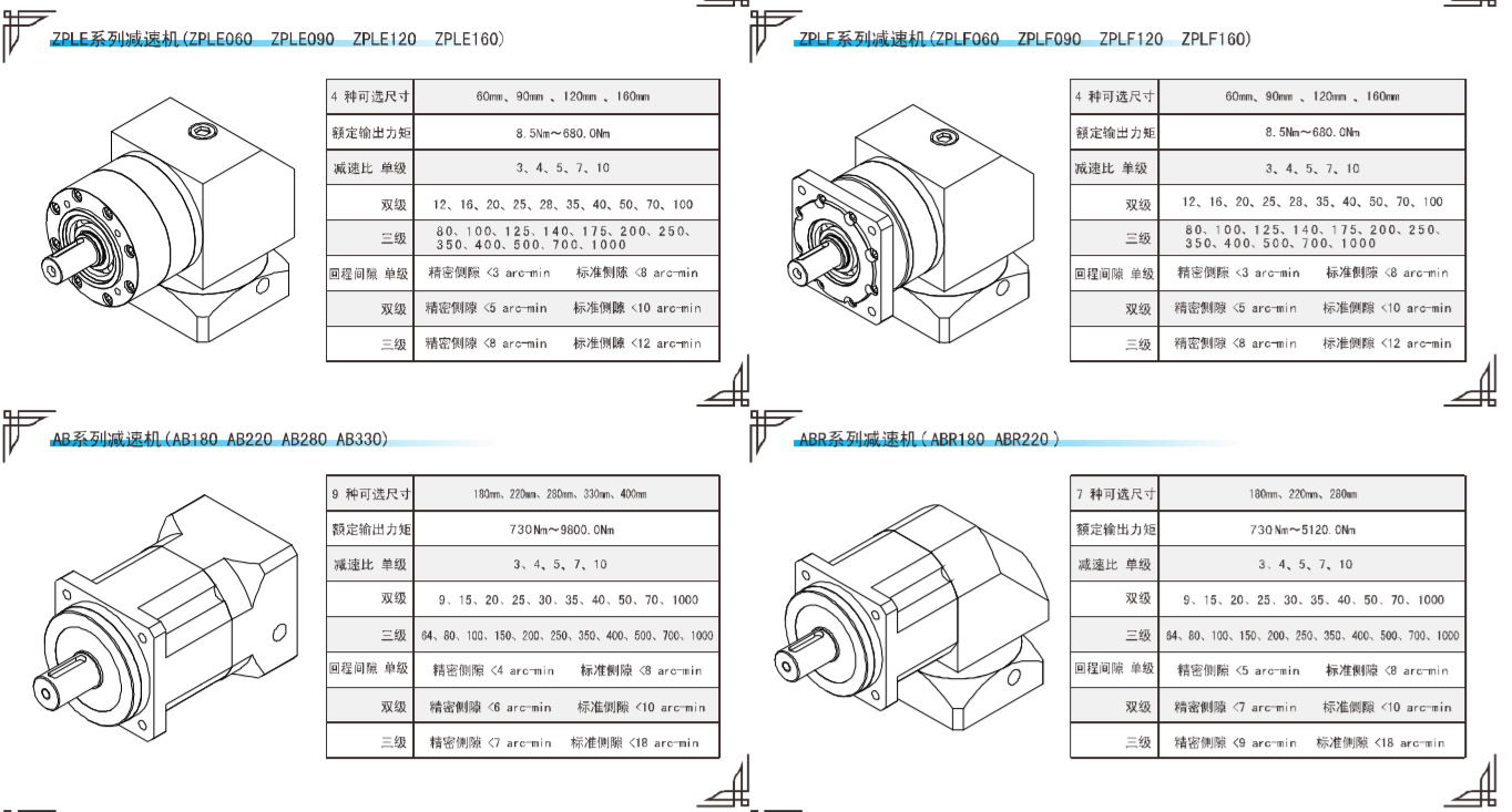 为同轴式方形法兰输出,具有精度高、钢性好、承载能力大、 效率高、寿命长、噪音低、体积轻小、外形美观,安装方便、定位精准等特点,适用于交流伺服马达、直流伺服马达、步进马达的减速传动。