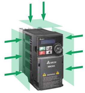 若使用變頻器驅動 般馬達,馬達的溫度將比使用市電供應操作時更高。低速運轉時冷卻效能將減弱,因此請降低馬達的轉矩輸出。若在低速運轉時需使用固定轉矩,則請使用備有外部電源驅動冷卻風扇的馬達。