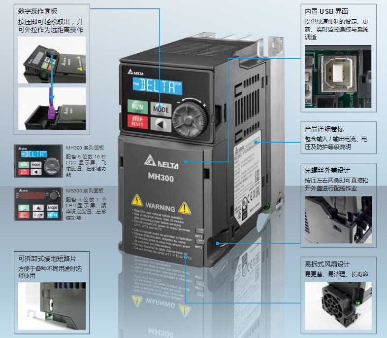 多种通讯界面 . MH300 系列内置 RS-485 (MODBUS) 与CANopen 通讯 . MS300 系列内置 RS-485 (MODBUS) 通讯 另提供多项选配通讯卡,支持多元应用与网络通讯需求 |