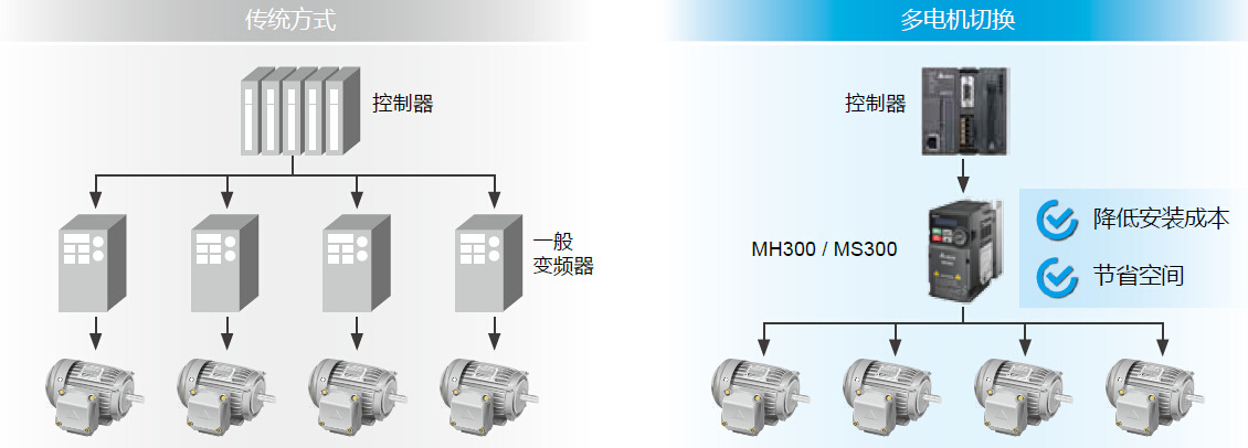 全新精巧设计 与前 代小型变频器产品相比,MH300系列与 MS300系列具备更完善的功能,体积却相对缩小, 高可节省40%的安装空间,有效提升空间使用效率 |