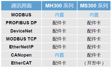 多种通讯界面 . MH300 系列内置 RS-485 (MODBUS) 与CANopen 通讯 . MS300 系列内置 RS-485 (MODBUS) 通讯 另提供多项选配通讯卡,支持多元应用与网络通讯需求 |