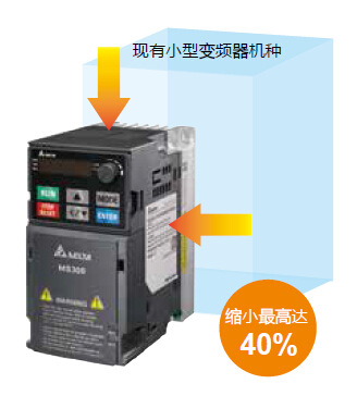 全新精巧设计 与前 代小型变频器产品相比,MH300系列与 MS300系列具备更完善的功能,体积却相对缩小, 高可节省40%的安装空间,有效提升空间使用效率 |
