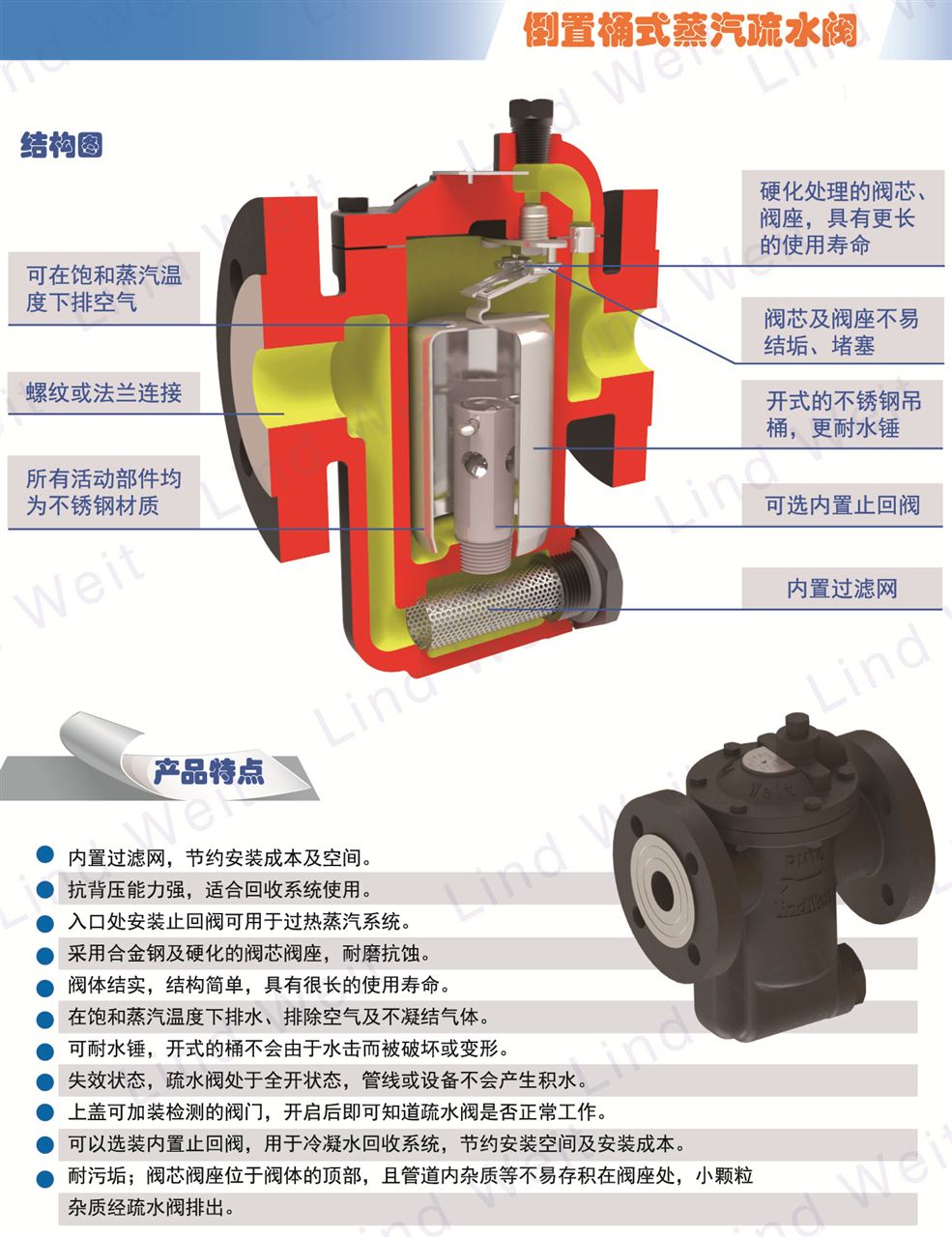 林德伟特蒸汽系统倒吊桶疏水阀通常用于蒸汽主管线、伴热管线、蒸汽的加热设备等需要提供高效疏水的系统。