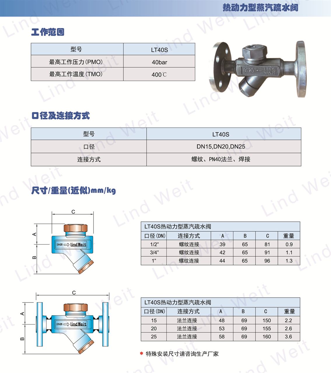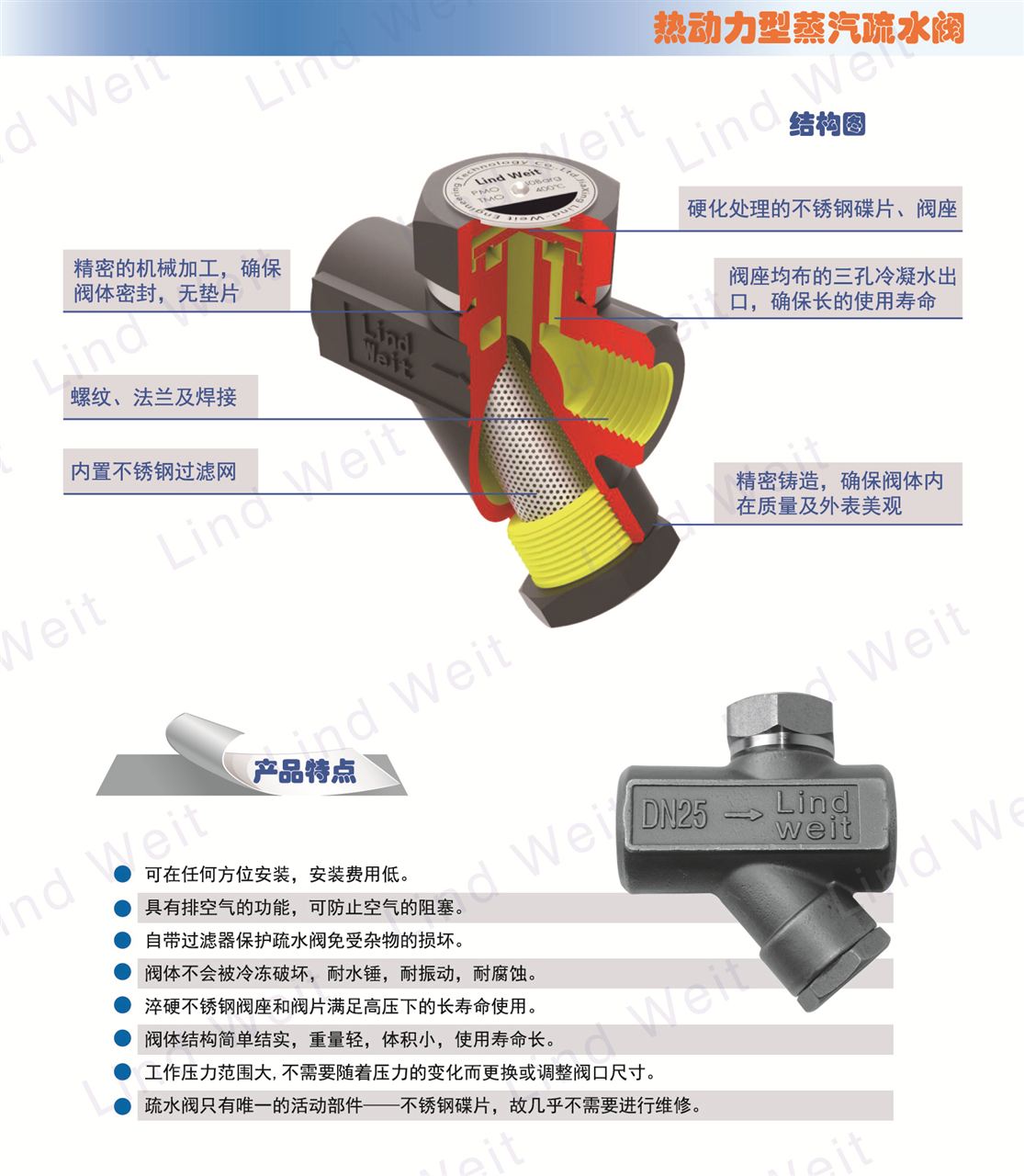 LindWeit林德伟特不锈钢热动力蒸汽疏水阀应用于蒸汽主管线和支管、伴热管线及小流量设备的疏水。广泛地应用于钢铁、化工、汽车、制药、食品饮料、造纸及其它使用中低压蒸汽的工业领域。