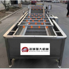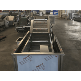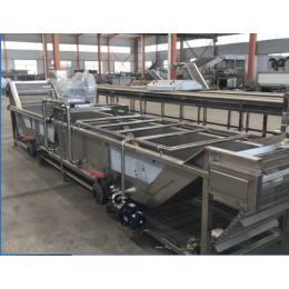 主要是利用箱体前部分设备箱体中注适量的水,经过加热管将水温加热,原料在经过箱体时,会与气泡机和水的结合作用下做翻滚状态,并随网带不断向前推进,在出水面时,高端设有喷淋头,高压冲洗。
