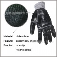 手套内胆采用涤纶或尼龙纱线编织而成,手掌热合毛刺,可用于宠物按摩,刷毛,洗澡等。手掌可浸丁腈,具有更良好的防滑、耐磨、防水功能,减少使用时的危害。袖口采用魔术搭扣设计,穿戴舒适更贴合手臂。