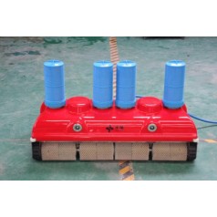 使用简单方便、采用坦克履带式行走机构、超强爬坡性能、可全自动或遥控工作、自带传感器、触壁自动掉头、逐行清理、电子防缠绕设计。双工模式,滤袋(10-100um)循环过滤和排水管直排。前置滚刷倍速刷洗清理更彻底、无盲区前置加大吸口轻松吸走沉淀、大物、树叶等、吸口后置橡胶刮板、对瓷砖、马赛克、塑胶膜、水泥池等更好的清理且不伤地面。对皮屑、砂砾、絮凝物等彻底清除。