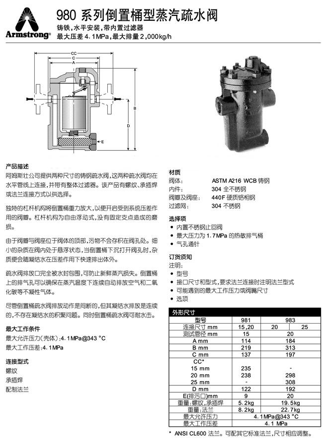 阿姆斯壮公司提供两种尺寸的铸钢疏水阀,这两种疏水阀均在水平管线上连接,并带有整体过滤器。该产品有螺纹、承插焊或法兰连接方式以供选择。
