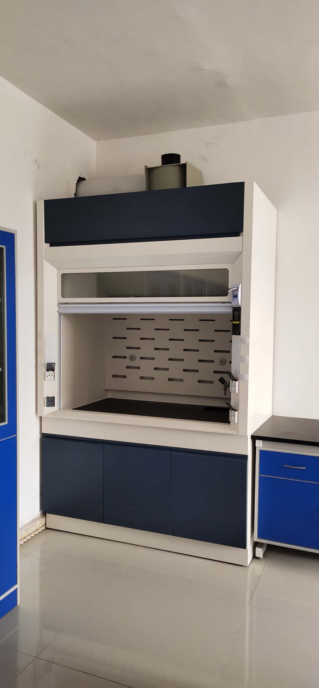 (6)照明:采用圆形节能孔灯,隐藏于顶板上,不与通风柜内实验气体直接接触,易更换,亮度完全满足实验要求。