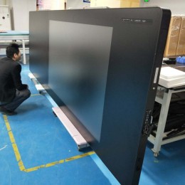 正面显示为 个由三块拼接而成的平面普通黑板,可以在上面用各种水笔书写,又可以根据需要采用粉笔书写。当打开电源时,中间 块显示出液晶的显示画面,可以进行触摸互动,而关掉时,显示画面隐形,又显示为 个普通黑板的表象,在上面进行书写,三年质保,属于国家采购网节能目录中产品,具有CCC认证