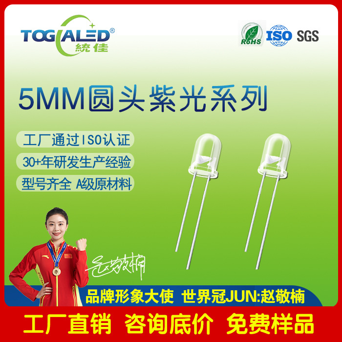 统佳直插5mm圆头紫光LED灯珠_紫光LED灯珠_F3紫光,整合国际原材料供应商资源,采用国际品牌有优势的深紫外外延片,德国ASM封装生产设备。产品具有光输出功率高,寿命久,全面解决行业用了 段时间容易死灯的问题,完全可以取代UVC汞灯管在固化,水处理,杀菌,消毒,空间消毒,空气净化等方面的应用。
