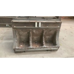 大三孔水泥料槽模具外型尺寸:900*730*430,是用的 多的 种。用加厚型钢板制作而成,重约80KG,成品水泥料槽可达342斤重,