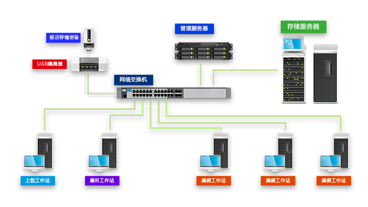 随着广播电视台业务系统信息化技术的飞速发展,各电视台 后建设并完善了数字化、网络化、智能化、信息化的广电业务系统。在当前信息技术系统建设中,广播电视行业的素材大部分都是通过移动存储方式存储,进入编播网络时 般是通过USB端口接入PC主机,由于USB介质往往在多台电脑使用过,因此USB介质难免会携带病毒。病毒 旦侵入编播电脑主机会迅速在网络内部传播,造成各种风险严重的会影响正常的编播工作,因此隔离USB存储介质上的病毒对于非编网络来说非常重要。